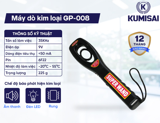 Máy dò kim loại cầm tay GP-008 hoạt động với tín hiệu rung và đèn nháy, cùng âm thanh cảnh báo khi phát hiện kim loại. Đồng thời có chế độ cảnh báo khi pin yếu, giúp người dùng nắm bắt tình trạng sử dụng.