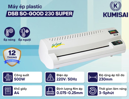 Máy ép plastic DSB SO-GOOD 230 SUPER là model nổi bật của DSB - một thương hiệu nổi tiếng của Đức chuyên sản xuất các thiết bị văn phòng và gia dụng. Các đặc điểm nổi bật của dòng máy có thể kể đến như: