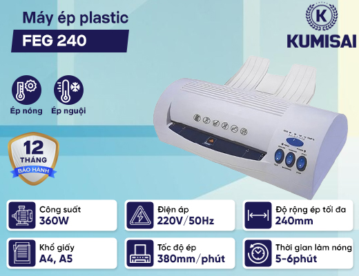 Máy ép plastic FEG 240 là một trong những model ép plastic khổ A4 được ưa chuộng nhất trên thị trường hiện nay, bởi sở hữu thiết kế nhỏ gọn, dễ sử dụng và giá cả cực kỳ “hạt dẻ”. Những thông tin dưới đây sẽ giúp bạn hiểu rõ hơn về thiết bị văn phòng này!