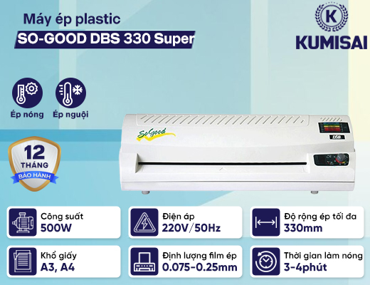 Máy ép plastic DSB SO-GOOD 330 SUPER là một lựa chọn tốt cho các văn phòng và gia đình cần một thiết bị ép plastic đáng tin cậy và hiệu quả. Với thiết kế bền bỉ, nhiều tính năng hữu ích và hiệu suất cao, máy này đáp ứng tốt nhu cầu bảo vệ và làm đẹp tài liệu. Liên hệ với Kumisai Việt Nam qua số hotline 0982 090 819 - 0983 898 758 để được tư vấn, giải đáp và hướng dẫn chọn mua!