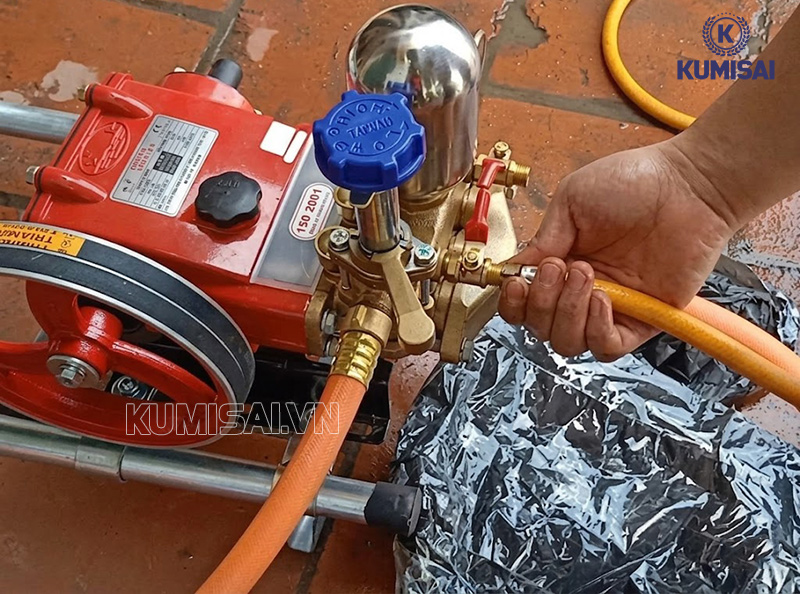 Điều chỉnh áp lực: Sử dụng núm vặn trên đầu bơm để điều chỉnh áp suất phù hợp.